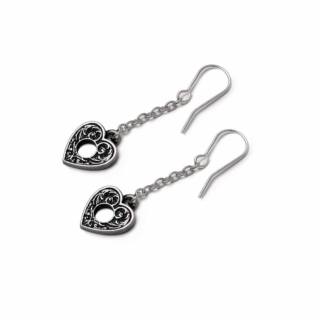 Let the whispering voices from the Ouija guide you through your mortal existence. A pair of delicately etched planchette earrings.//Perfectly paired with P937 Crowley’s Spirit Board.