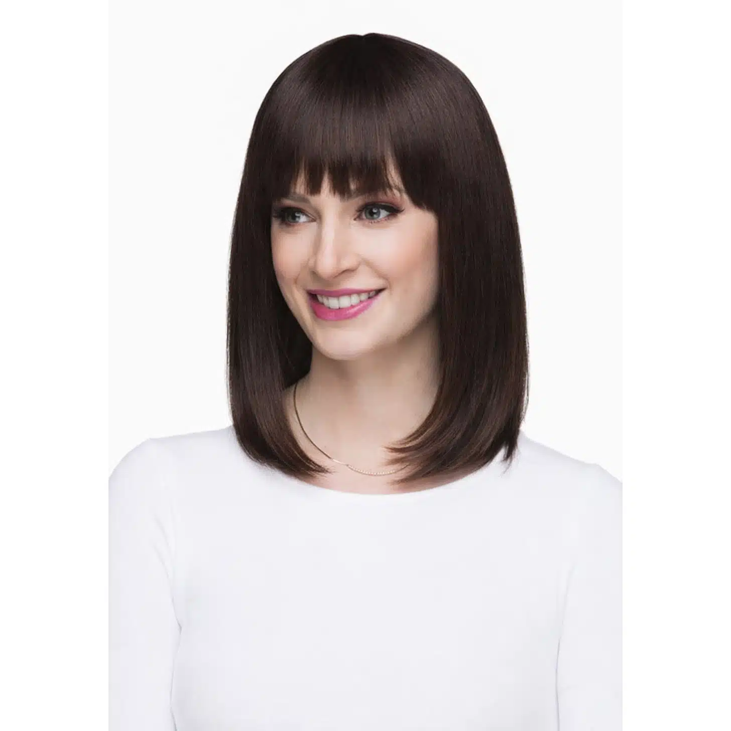 The Dara Dark Brown Wig is a chic, everyday option for anyone seeking a sleek and polished look. This wig features a classic, straight cut that falls just above the shoulders, exuding effortless sophistication. The dark brown hue is rich and natural, providing an elegant contrast against various skin tones, while the blunt bangs offer a modern edge, perfectly framing the face.