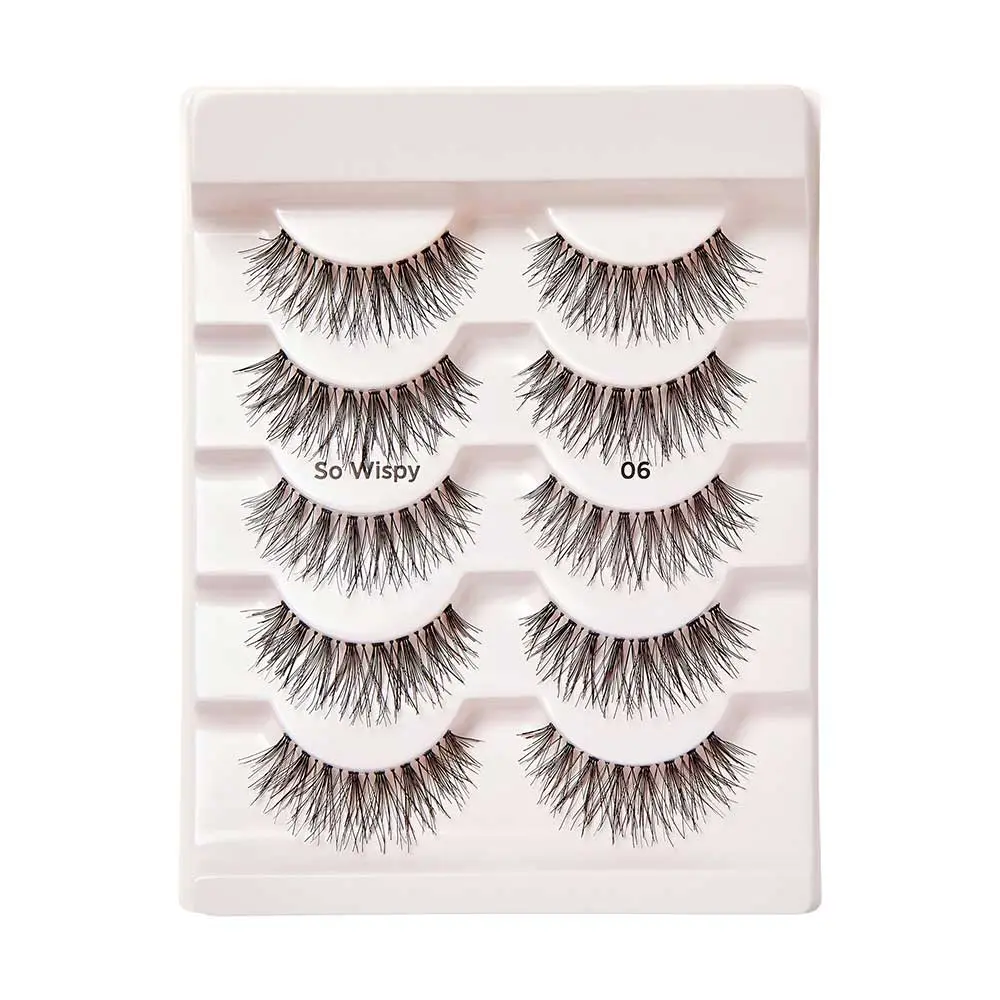 Multi pack contains five pairs of So Wispy lashes. Everyday wear lashes designed to work with what you’re working with. The wispy lashes graduate from short to long, and each feature a clear band (invisible to the eye) for that nothing-but-natural look.
