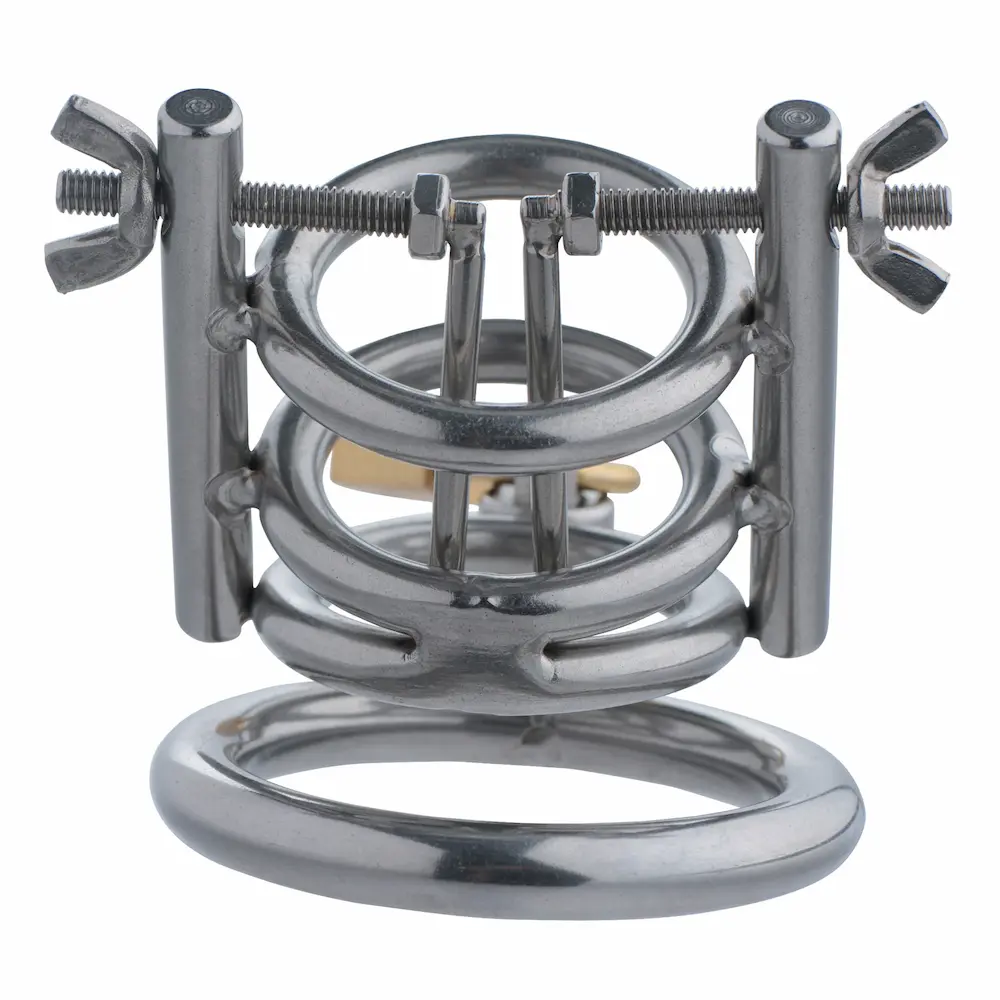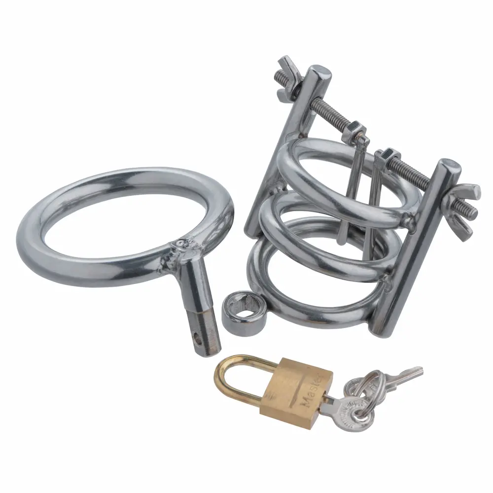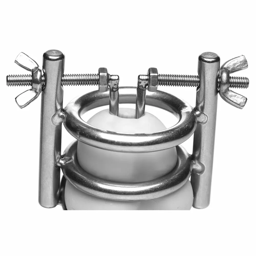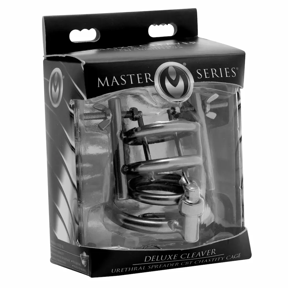 Confine your slaves penis in a CBT device that will ensure he experiences no pleasure! This chastity cage does more than just trap his cock and balls in cold, unrelenting stainless steel. It also features two spreaders, rounded and controlled by thumbscrews, to elevate your sadistic fantasies! Push his entire package through the base ring and then his shaft through the other three rings, and then lock into place. How long will you force your naughty boy to withstand the torment of the Deluxe Cleaver? Cleans and sterilizes easily with mild soap and warm water.