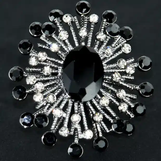A Unique Design Featuring a Large Black Gem in the middle of the ring, accompanied by a Plethora of Silver and Black Gems branching off from the Large Gem.