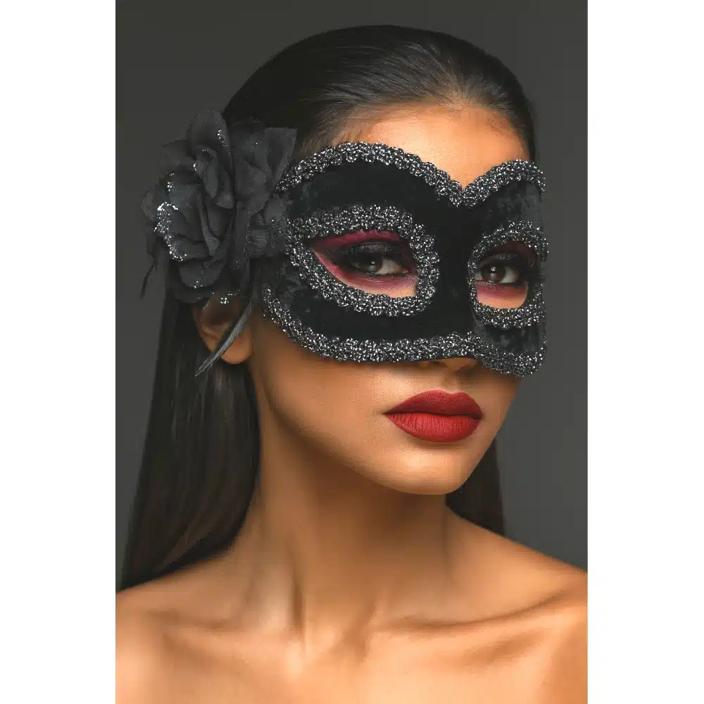Step into the mystery and allure of the night with this Velvet Masquerade Mask by Shirley of Hollywood. Crafted from luxurious black velvet, this elegant mask features sparkling trim that shimmers under the light, drawing attention to your eyes with a captivating frame. A dramatic fabric flower accent on the side adds a romantic, feminine flourish, making it perfect for masquerade balls, costume parties, or an unforgettable night of seduction.